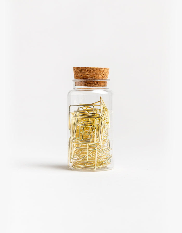 סט של 50 אטבי נייר בעיצוב גיאומטרי בצבע זהב, המוסיפים סטייל ואלגנטיות לשולחן העבודה. יכולים לשמש גם כסימניות, לשימוש בבית, במשרד או בדרכים.