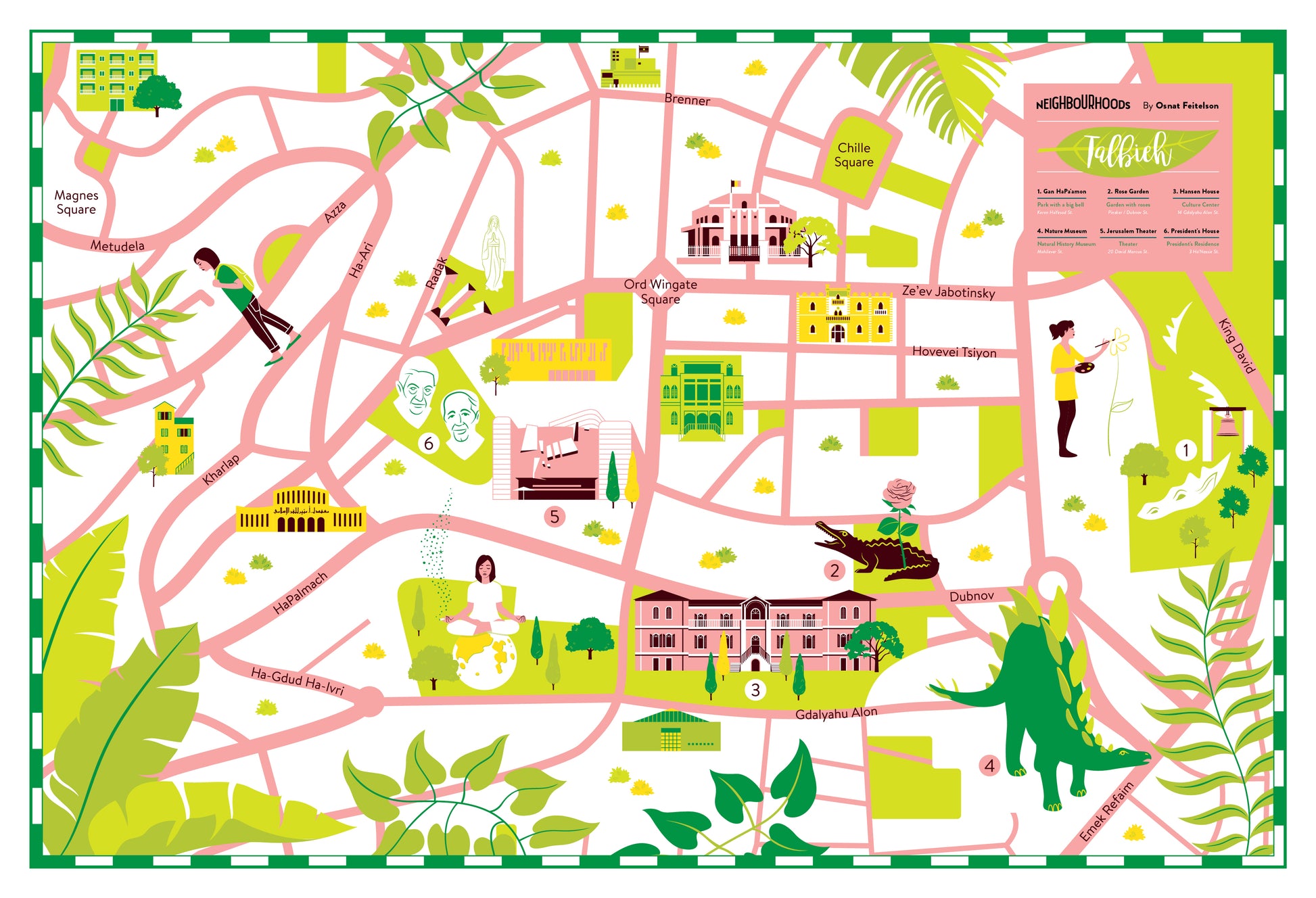 מפה מאויירת של טלביה בירושלים, שאיירה אסנת פייטלסון, כחלק מפרוייקט "נייברהודס"