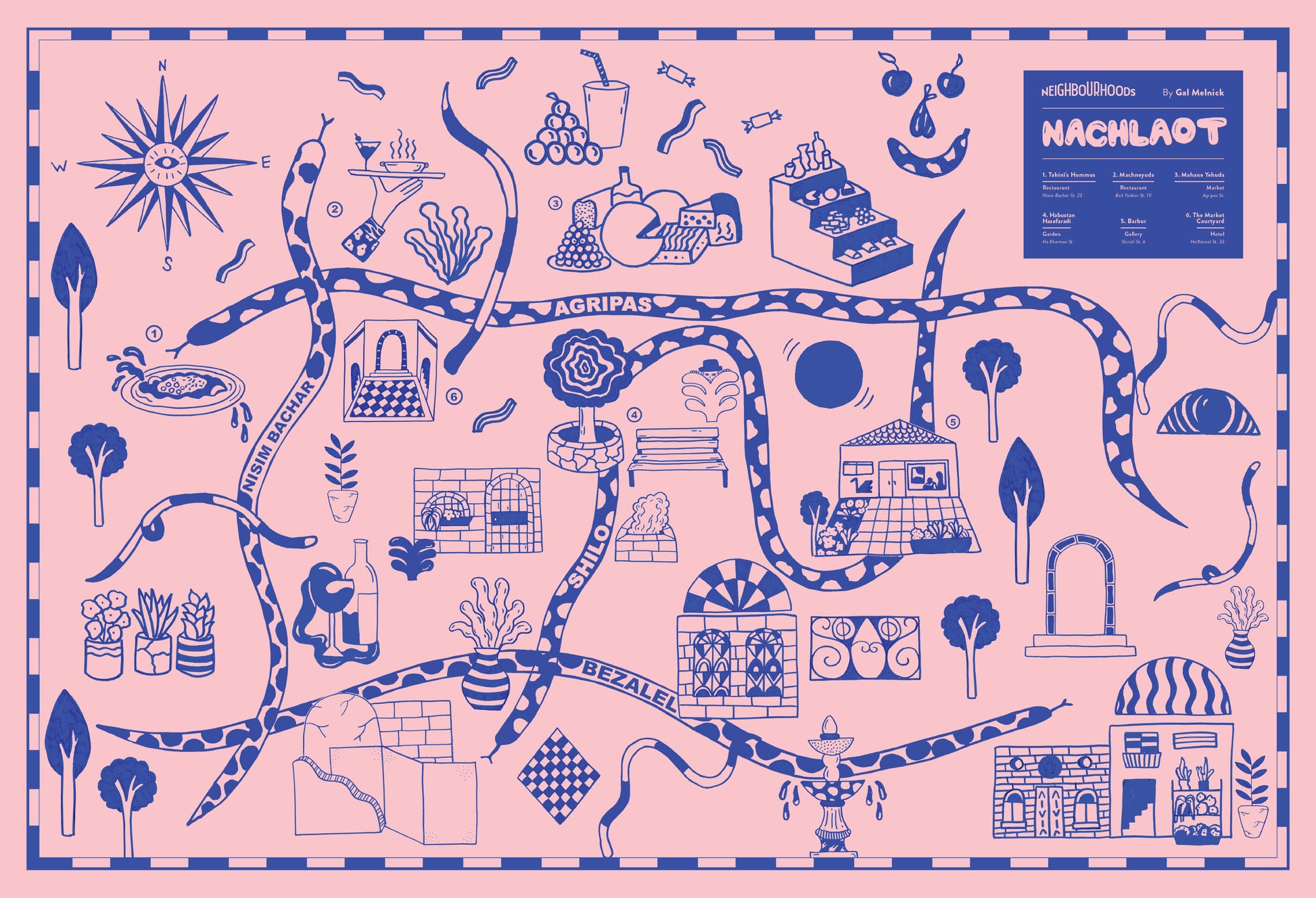 מפה מאויירת של נחלאות בירושלים, שאיירה גל מלניק, כחלק מפרוייקט "נייברהודס"
